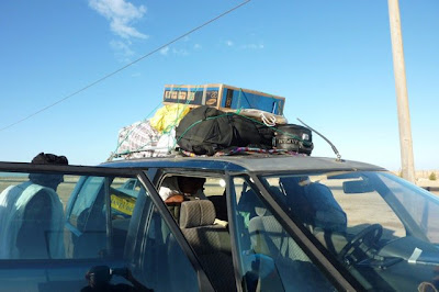 The TV still wasn't working out, so all the luggage came back out of the vehicle. Bamba and the maybe-Tuareg and the wi-fi guy had a discussion, then piled a bunch of stuff up on the roof and tied it down. The television was now in the back and my bag was on the roof.